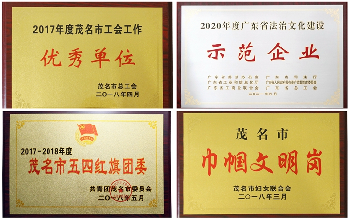 ▲集團(tuán)榮譽(yù)獎(jiǎng)牌(摘選) 幾年來,集團(tuán)工會(huì)榮獲“茂名市工會(huì)工作優(yōu)秀單位”稱號(hào),集團(tuán)財(cái)務(wù)部女職工榮獲“茂名市巾幗文明崗”稱號(hào);集團(tuán)團(tuán)委成立青年志愿者服務(wù)隊(duì),助力雙創(chuàng)工作,連續(xù)三年榮獲“茂名市五四紅旗團(tuán)委”稱號(hào)。集團(tuán)憑借系列企業(yè)文化建設(shè)成果,先后榮獲 “中國企業(yè)文化建設(shè)典范企業(yè)”“廣東省先進(jìn)集體”“廣東省優(yōu)秀企業(yè)”“廣東省企業(yè)文化建設(shè)最佳實(shí)踐單位”“廣東省法治文化建設(shè)示范企業(yè)”等榮譽(yù),被譽(yù)為茂名市屬國有企業(yè)的標(biāo)桿與典范。 結(jié)語 十年積跬步,足下至千里;仨甑姆欠舱鞒,茂名港人矢志艱苦奮斗,勇于擔(dān)當(dāng)作為,爭當(dāng)茂名向海而興排頭兵,在茂名經(jīng)濟(jì)發(fā)展史上留下堅(jiān)實(shí)的足印。
